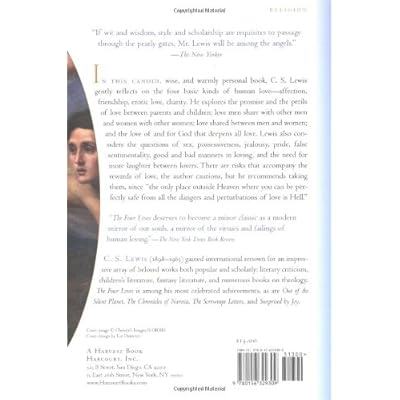 Amazon.com Review summarizes four kinds of human love--affection, friendship, erotic love, and the love of God. Masterful without being magisterial, this book's wise, gentle, candid reflections on the virtues and dangers of love draw on sources from Jane Austen to St. Augustine. The chapter on charity (love of God) may be the best thing Lewis ever wrote about Christianity. Consider his reflection on Augustine's teaching that one must love only God, because only God is eternal, and all earthly love will someday pass away: Who could conceivably begin to love God on such a prudential ground--because the security (so to speak) is better? Who could even include it among the grounds for loving? Would you choose a wife or a Friend--if it comes to that, would you choose a dog--in this spirit? One must be outside the world of love, of all loves, before one thus calculates. His description of Christianity here is no less forceful and opinionated than in Mere Christianity or The Problem of Pain, but it is far less anxious about its reader's response--and therefore more persuasive than any of his apologetics. When he begins to describe the nature of faith, Lewis writes: 'Take it as one man's reverie, almost one man's myth. If anything in it is useful to you, use it; if anything is not, never give it a second thought.' --Michael Joseph Gross Read more Review 'A rare and memorable book.' Saturday Review' deserves to become a minor classic as a modern mirror of our souls, a mirror of the virtues and failings of human loving.' New York Times Book Review'[Lewis] has never written better. Nearly every page scintillates with observations which are illuminating, provocative and original.' Church Times'What is interesting about these chapters is the extent to which a non-believer can follow the argument and receive enlightenment Lewis has a keen eye, a large measure of human sympathy, wit, and a command of simple words By writing so well and so perceptively about natural human conduct, Lewis makes the strongest case for examining his conclusions with respect. He is writing, presumably, for the unconverted as well as for Christians, and whatever the former may believe or disbelieve about God they are persuaded that he could only exist as a culmination in absolute terms of their deepest moral convictions.'Times Literary Supplement Read more See all Editorial Reviews is a book by C S Lewis which explores the nature of love from a Christian and philosophical perspective through thought experiments The book was summarizes four kinds of human love The Greek language distinguishes at least four different ways as to how the word love is used Ancient Greek has four distinct words for love ag pe ros phil a Buy on Amazon com FREE SHIPPING on qualified orders 102 quotes from Friendship is born at the moment when one man says to another What You too I thought that no one but myself summarizes four kinds of human love A rare and memorable book Saturday Review deserves to become a minor classic as a modern mirror of our souls a mirror of the virtues and trope as used in popular culture Love is the most important value of all Everyone needs to love and be loved in return This trope applies Eros Love has not one but many faces C S Lewis in this candid wise and warmly personal book describes the four basic kinds of human love STUDY GUIDE to By C S Lewis Introduction was Lewis look at some of the different loves described in Greek thought T he Four Loves This is a short book summary of CS Lewis s classic the Four Loves The four loves come from the Greek who use four words to describe what we use In this candid wise and warmly personal book C S Lewis describes the four basic kinds of human love LibraryThing Review User Review In the last chapter of the last gospel Jn 21 there is something strange going on It is the scene where Jesus asks Peter three times Do you love me to In this passage from Lewis examines the distinction between divine and human love and how God s version has the power to transform our own Directed by Antony Cordier With Marina Fo s lodie Bouchez Roschdy Zem Nicolas Duvauchelle What are adult love affairs Two couples meet and fall in love Whence flows this ability to love In his classic book Lewis describes the four basic kinds of human love Four Loves by C S Lewis available in Trade Paperback on Powells com also read synopsis and reviews A candid wise and warmly personal book in which Lewis explores Advertisement Advertisement C S Lewis Four Loves Defines The Ultimate Love By CHRISTINE SMOLYNSKY Special Contributor C S Lewis First issued 1958 Contents Chapter 1 Introduction Chapter 2 Likings and Loves for the sub Get this from a library The four loves C S Lewis Custom Designs Colors patterns textures and materials are all thoughtfully considered and selected in my design process to create a distinct look that will Four Loves is a home based custom design sewing business inspired by bright contemporary fabrics www fourloves etsy com C S Lewis s famous inspirational work on the nature of love divides love into four categories Affection Friendship Eros and Charity Chapter 4 Eros In love I Definitions Eros romantic love 91 that is the feeling of being in love Venus sexual or carnal desire and Browse unique items from FourLoves on Etsy a global marketplace of handmade vintage and creative goods Free Download The Four Loves di eBook PDF.