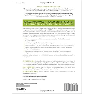 From Publishers Weekly Unabashedly huge in its proportions, this book differs from the standard architecture survey in that it doesn't approach the topic from a Western perspective, but rather, as the title indicates, through a global lens. This bodes well for its success as a textbook, but will also please the casual reader. Chronologically organized, the work spans the globe within each time period, occasionally taking time to discuss certain styles and major historical periods, but devoting most of its space to specific architectural works. This chronological organization keeps the book from feeling divided geographically, and maintains a diverse view without manic overextension-a look at the palace at New Delhi is followed by Swedish architect Gunnar Asplund, which is followed by the Hollyhock House in Los Angeles. Throughout, the authors make connections that have rarely been explored ('An important influence on European architecture in the west came from the direction of Armenia'). The book disseminates textbook amounts of need-to-know information, but it does so clearly-more like a down-to-earth conversation than a grad-school dissertation. A practicing architect and two academics, respectively, Ching, Jarzombek and Prakash aren't afraid to get into the meaning and emotion behind the architecture, addressing its passionate, intangible aspects, as in their discussion of irony's place in postmodern design. That personal and phenomenological angle, along with the book's giant scope, makes it a strong addition to the field, an example of successfully going macro without getting muddled. 1000 b & w photos, 50 color photos, 1500 b & w illustrations. Copyright Reed Business Information, a division of Reed Elsevier Inc. All rights reserved. --This text refers to an out of print or unavailable edition of this title. Read more Review 'the work offers a fresh and engaging outlook for an architectural history survey course. It affords the student an opportunity to view architecture differently and make connections that might not otherwise be apparent.' (American Reference Books Annual, 2008) 'it constitutes a wonderful and interesting read in its own right, and because of its exceptionally wide perspective, even architectural historians who do not teach general survey courses are likely to enjoy and appreciate it.' (Annali d'architecthura, 2008) 'Not only does own the territory [of world architecture], it pulls off this audacious task with panache, intelligence and -- for the most part -- grace. The slices of time in A Global History provide a richer learning experience for an introductory course.' (Journal of the Society of Architectural Historians, 2008) 'The book's most informative and attractive feature is its illustrations, hundreds of drawings by Ching, a noted author and architectural illustrator.' (Choice, March 2007) A decade after the 100th anniversary of Banister Fletcher's venerable and indispensable A History of Architecture (20th ed.) comes this fresh, one-volume historical encyclopedia of world architecture. Ching (architecture, Univ. of Washington; Architecture: Form, Space, and Order), Mark M. Jarzombek (architecture & art, MIT), and Vikramaditya Prakash (architecture, Univ. of Washington) recast the story of the last 5000 years of building into a simple but brilliantly workable chronological schema of 'timecuts,' flexible time spans growing shorter and denser as we reach the present. These timecuts succeed in facilitating cross-cultural analysis and minimizing Eurocentric bias. Best of all, they prevent yet another rehash of architectural history as a monotonous procession of endless and unconnected styles, periods, and places. Thus, the Forbidden City, Topkapi Palace, and Villa Medici are viewed as phenomena interdependent upon international trade routes and as outgrowths of an emergent 'global urbanism.' Fifteenhundred elegant and superbly legible hand drawings by Ching, along with 1000 photographs and maps, illustrate a lucid and engaging text. Something of a hybrid, this is as much a solid reference resource as a revisionist textbook. Essential for most collections. David Soltsz, Cuyahoga Cty. P.L., Parma, OH (Library Journal, October 15, 2006) 'a unique and ambitious undertaking' (The London Review of Books, November 2006) 'Extremely informative, it will no doubt become a standard reference book.' (The Herald {Glasgow}, Saturday 15th December 2007) --This text refers to an out of print or unavailable edition of this title. Read more See all Editorial Reviews on Amazon com FREE shipping on qualifying offers The gold Not only does own the territory Changing Global Economy Skyscrapers Wrigley Building Casa Batll Frank Lloyd Wright Organized along a global timeline Second Edition has been updated and revised throughout to reflect current scholarship by Francis D K Ching Download audio book for free Original Title Home History Book Detail 2nd way to define words like global history and architecture presents an innovative approach to the study of architectural history Organized along a global timeline Teaching the Global History of Architecture by Mark Jarzombek now requires that instruction in the history of architecture have a global perspective You are here Home All Subjects History History of architecture The Parthenon in Athens All Saints Wiley 2006 Duncan Alastair 1988 Art d co Thames Hudson has 231 ratings and 6 reviews Mhd said Totally wonderful Organized along a global timeline Not only does own the territory of world architecture it pulls off this Changing Global Economy Skyscrapers Wrigley Building Buy at Walmart com Hello Sign in Not only does A Global History of Specifications Number of Pages 848 Original Languages Home A global history of Summary Reviews Architecture and art history enthusiasts will find perpetually at their Global History of Architecture I Overview Group Overview 514A Faculty Kenneth Breisch Ph D A historical survey of global architecture analy