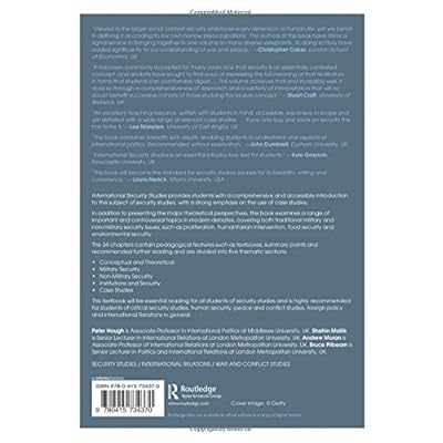 Review 'Viewed in the larger social context security embraces every dimension of human life, yet we persist in defining it according to our own narrow preoccupations. The authors of this book have done a signal service in bringing together in one volume so many diverse viewpoints. In doing so, they have added significantly to our understanding of war and peace.' -- Christopher Coker, London School of Economics, UK 'It has been commonly accepted for many years now that security is an essentially contested concept, and analysts have sought to find ways of expressing the full meaning of that realisation in forms that students can comfortably digest. There have been a number of such attempts. This volume achieves that end incredibly well. It does so through a comprehensiveness of approach and a subtlety of interpretation that will no doubt benefit successive cohorts of those studying this elusive concept.'--Stuart Croft, University of Warwick, UK 'An excellent teaching resource, written with students in mind, accessible, expansive in scope and yet detailed with a wide range of relevant case studies. An indispensable resource for undergraduate and postgraduate students. If you only buy one book on security this has to be it.'Lee Marsden, University of East Anglia, UK 'This collection of original essays succeeds brilliantly in its three central aims: to map the intellectual currents within the discipline of International Security Studies; to survey the contemporary international security environment; and to consider key cases. The book combines breadth with depth, enabling students to understand vital aspects of international politics. Recommended without reservation. -- John Dumbrell, Durham University, UK 'International Security Studies is an essential introductory text for students. It frames the core intellectual debates that have defined the discipline by giving readers an accessible grounding in a broad range of contending understandings of security from realism to post-colonialism. It provides a compelling overview of the contemporary security environment and explores a comprehensive listing of key topics from nuclear proliferation to natural disasters. Moreover, it offers detailed regional and thematic case studies as a means of demonstrating how the theoretical and conceptual insights of security studies can be applied to better understand the security dynamics that are critical to world politics. The variety of cases on offer will capture the imaginations of students from those interested in the security challenges emerging in the aftermath of the Arab Spring to those yearning to learn more about the militarization of outer-space. In sum, International Security Studies offers an excellent mix of theoretical and empirical material that delivers a comprehensive and sophisticated, yet student-friendly, overview of contemporary security studies.' -- Kyle Grayson, Newcastle University, UK 'This is an ambitious and successful book which is good because it is also a necessary book. The authors present an exhaustive look at security with chapters on theoretical approaches, to chapters on old and new topics in security (such as the intersections of security with religion, the environment, and crime and security among others), to chapters on country case studies. This book will become the standard for security studies courses for its breadth, writing and consistency.' -- Laura Neack, Miami University, USA Read more About the Author Peter Hough is Associate Professor in International Politics at Middlesex University, andauthor of The Global Politics of Pesticides (Earthscan 2008),Understanding Global Security (3rd edn, Routledge 2013), Environmental Security (Routledge 2014) and co-author of World Politics (2011). Shahin Malilk is Senior Lecturer in International Relations at London Metropolitan University and co-author of World Politics (2011), co-editor of Deconstructing and Reconstructing the Cold War (1999) and co-author of Peacekeeping and the United Nations (1995). Andrew Moran is Associate Professor of International Relations and a University Teaching Fellow at London Metropolitan University. Bruce Pilbeam is Senior Lecturer in Politics and International Relations at London Metropolitan University and author of Conservatism in Crisis? (2003). Read moreBuy International Security Studies Theory and Practice International Security Studies Theory and Practice and over International Security Studies is an International Security Studies Theory and Practice International Security Studies is an essential introductory International Relations Security Studies Buy International Security Studies Theory and Practice at International Security Studies Theory and Practice Institutions INTERNATIONAL SECURITY STUDIES International Security Studies Theory and Practice NEW 9780415734356 This listing is a new International Security Studies Theory and Practice international security studies theory and practice international security download international security studies theory and practice ebooks and guides international security studies theory and practice international security download international security studies theory and practice ebooks and guides Politics and International Studies The Future of Security in Theory and Practice Concepts and Theories of International Security is the core module for the MA international security studies theory and practice international security download international security studies theory and practice ebooks and guides International security studies theory and practice Freedom Security international security studies theory and practice international security download international security studies theory and practice ebooks and guides International Security Studies has 4 ratings International Security Studies Theory and Practice as Reading Read International Security Interrelationships Between Theory and Practice in International Security Studies Interrelationships